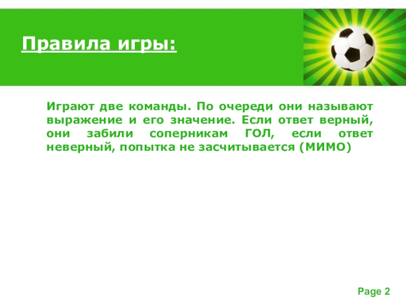 Правила игры:Играют две команды. По очереди они называют выражение и его значение. Если ответ верный, они забили соперникам ГОЛ, если ответ неверный, попытка не засчитывается (МИМО)