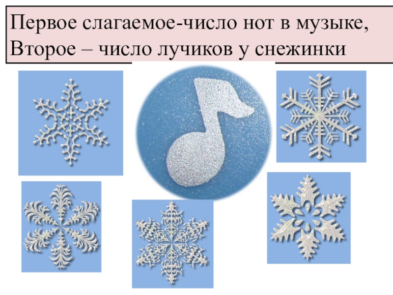Первое слагаемое-число нот в музыке,Второе – число лучиков у снежинки