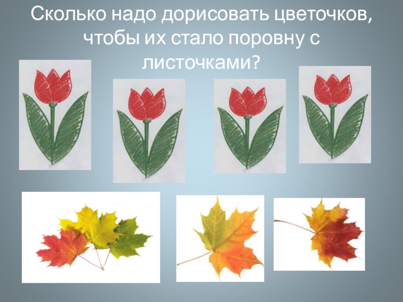 Слайд 4Сколько надо дорисовать цветочков, чтобы их стало поровну с листочками?