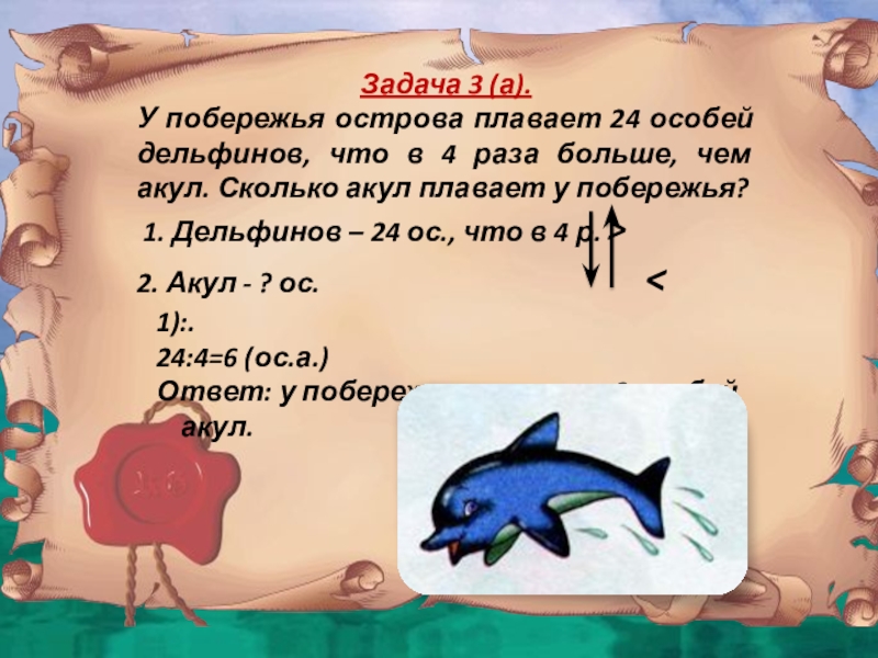 У побережья острова плавает 24 особей дельфинов, а акул в 4 раза меньше, чем дельфинов. Сколько акул плавает у побережья?