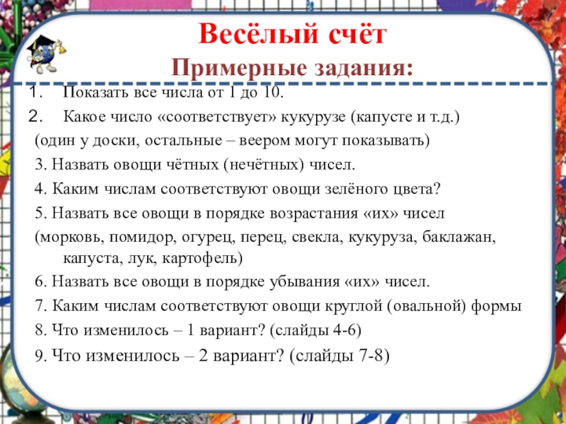 Весёлый счёт Примерные задания:Показать все числа от 1 до 10.Какое число «соответствует» кукурузе (капусте и т.д.)(один у доски, остальные – веером могут показывать)3. Назвать овощи чётных (нечётных) чисел. 4. Каким числам соответствуют овощи зелёного цвета?5. Назвать