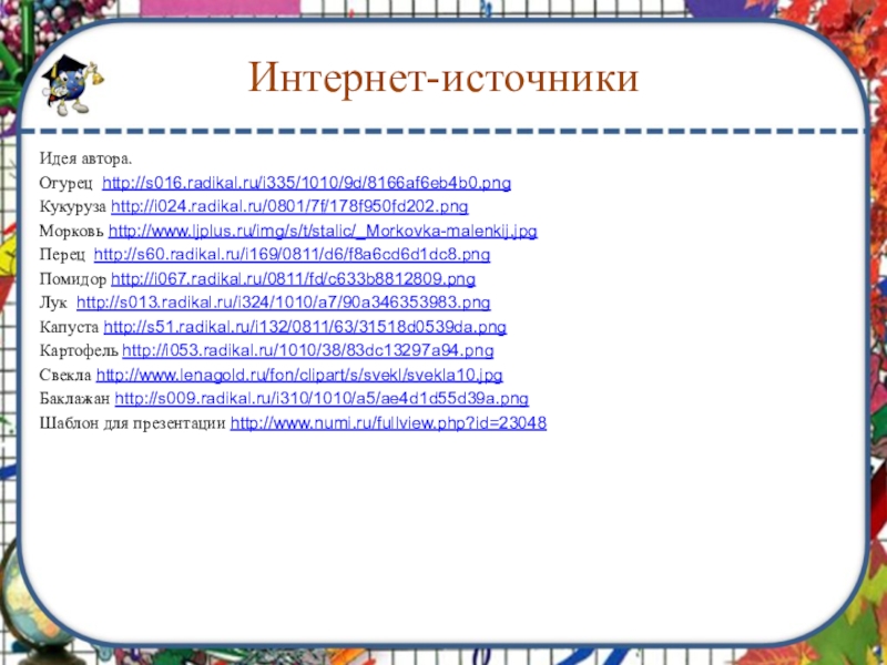 Интернет-источникиИдея автора.Огурец http://s016.radikal.ru/i335/1010/9d/8166af6eb4b0.pngКукуруза http://i024.radikal.ru/0801/7f/178f950fd202.pngМорковь http://www.ljplus.ru/img/s/t/stalic/_Morkovka-malenkij.jpgПерец http://s60.radikal.ru/i169/0811/d6/f8a6cd6d1dc8.pngПомидор http://i067.radikal.ru/0811/fd/c633b8812809.pngЛук http://s013.radikal.ru/i324/1010/a7/90a346353983.pngКапуста http://s51.radikal.ru/i132/0811/63/31518d0539da.pngКартофель http://i053.radikal.ru/1010/38/83dc13297a94.pngСвекла http://www.lenagold.ru/fon/clipart/s/svekl/svekla10.jpgБаклажан http://s009.radikal.ru/i310/1010/a5/ae4d1d55d39a.pngШаблон для презентации http://www.numi.ru/fullview.php?id=23048