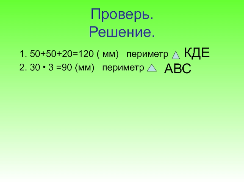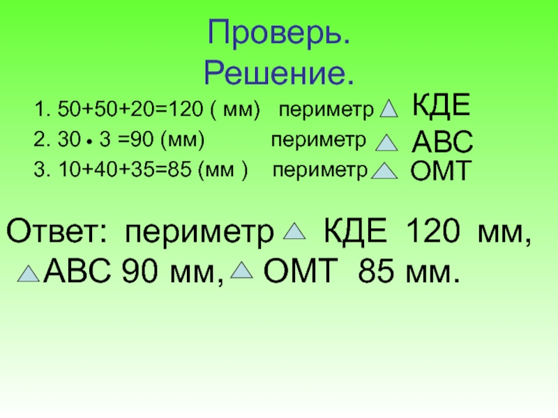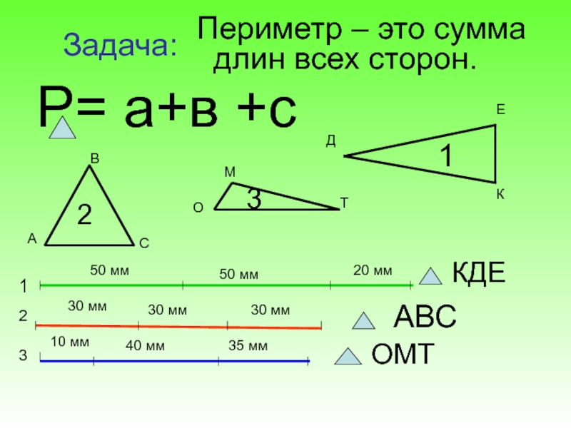 Ответ: периметр КДЕ 120 мм, АВС 90 мм, ОМТ 85 мм.