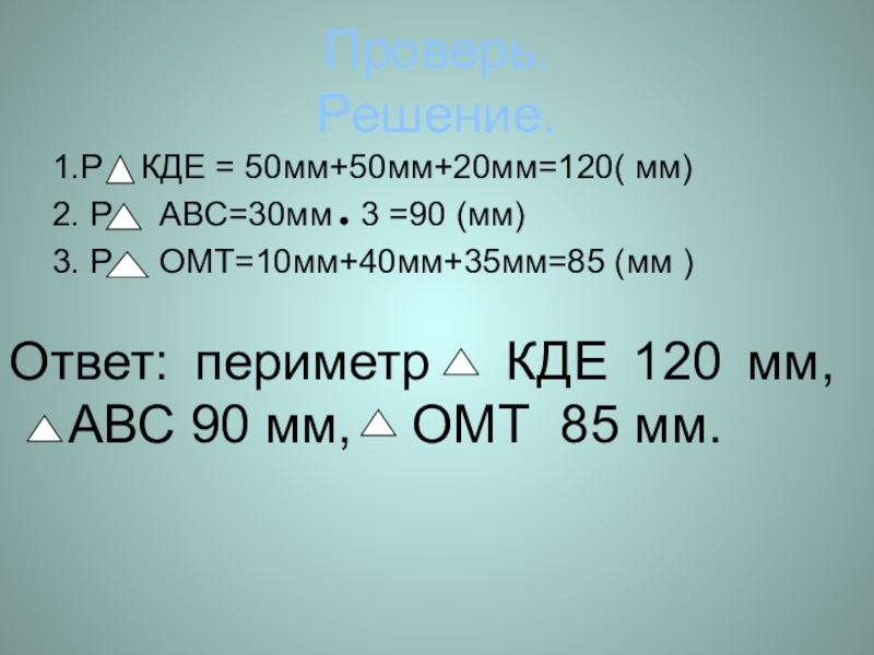 Ответ: периметр КДЕ 120 мм, АВС 90 мм, ОМТ 85 мм.