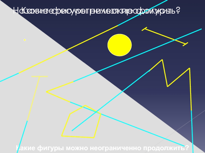 Назовите геометрические фигурыКакие фигуры можно неограниченно продолжить?Какие фигуры нельзя продолжить?