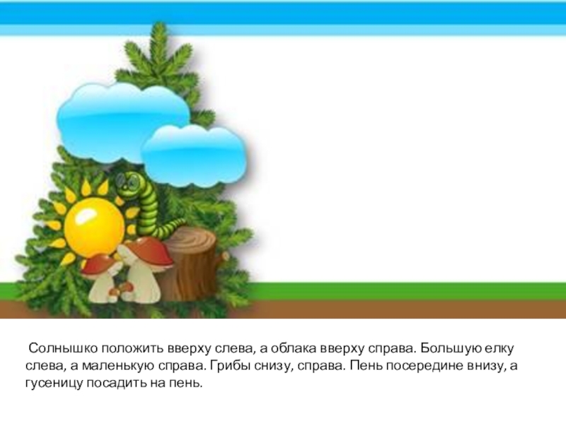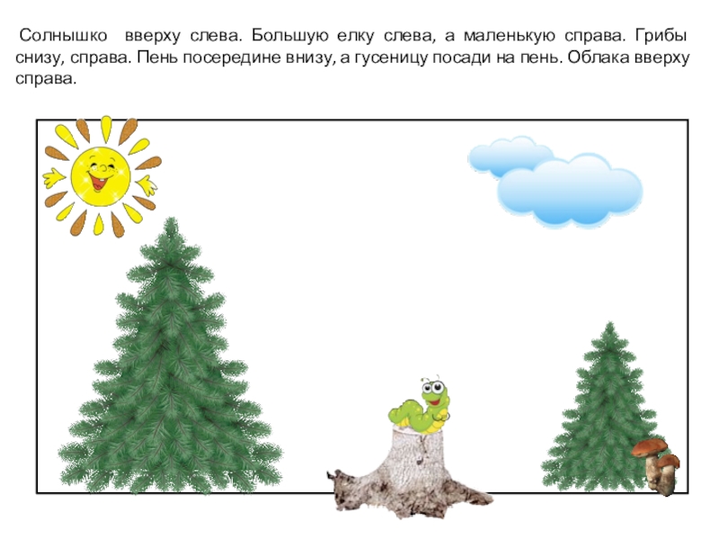 Слайд 13 Солнышко вверху слева. Большую елку слева, а маленькую справа. Грибы снизу,