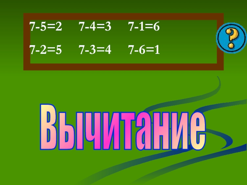 7-5=2		7-4=3		7-1=67-2=5		7-3=4		7-6=1Вычитание