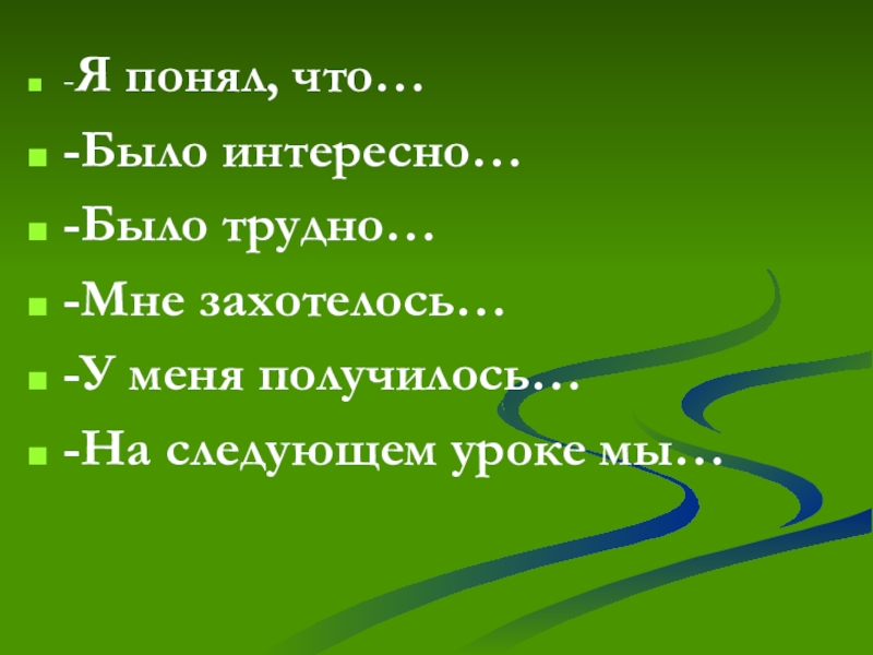 -Я понял, что…-Было интересно…-Было трудно…-Мне захотелось…-У меня получилось…-На следующем уроке мы…