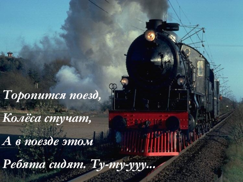Торопится поезд,Колёса стучат,А в поезде этомРебята сидят. Ту-ту-ууу...