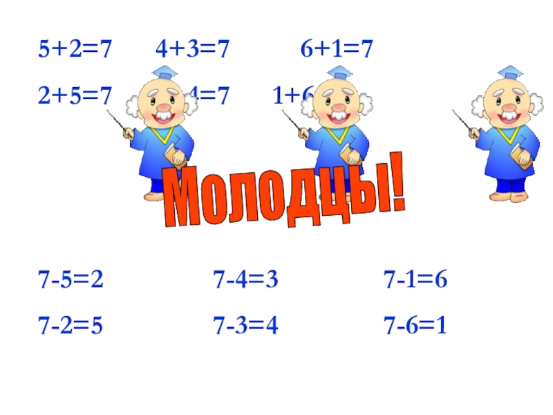 5+2=7		 4+3=7 		 6+1=72+5=7		 3+4=7		 1+6=77-2=57-5=27-4=37-3=47-6=17-1=6Молодцы!