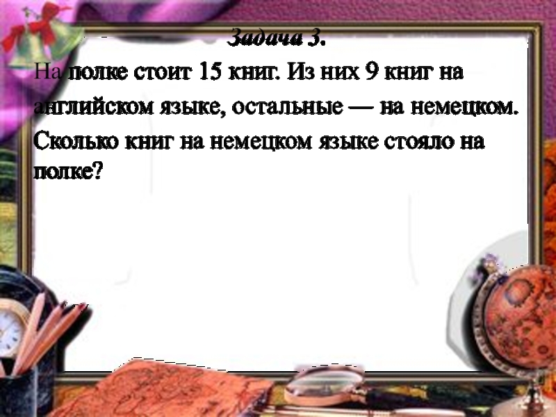 Задача 3.На полке стоит 15 книг. Из них 9 книг наанглийском языке, остальные — на немецком.Сколько книг