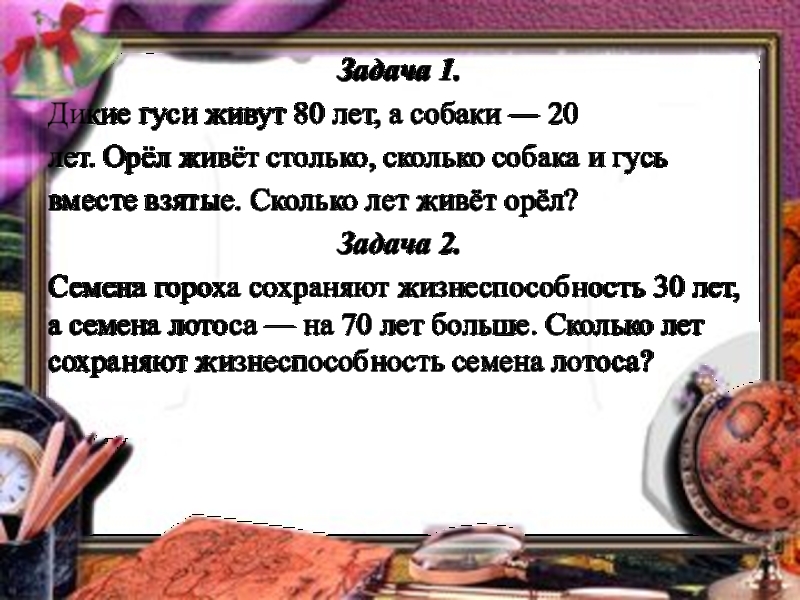 Задача 1.Дикие гуси живут 80 лет, а собаки — 20лет. Орёл живёт столько, сколько собака и гусьвместе взятые. Сколько лет живёт орёл?Задача 2.Семена гороха сохраняют жизнеспособность 30 лет, а семена лотоса — на 70 лет больше.