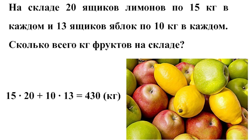 15 ∙ 20 + 10 ∙ 13 = 430 (кг)