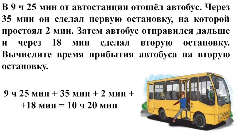 9 ч 25 мин + 35 мин + 2 мин + +18 мин = 10 ч 20 мин