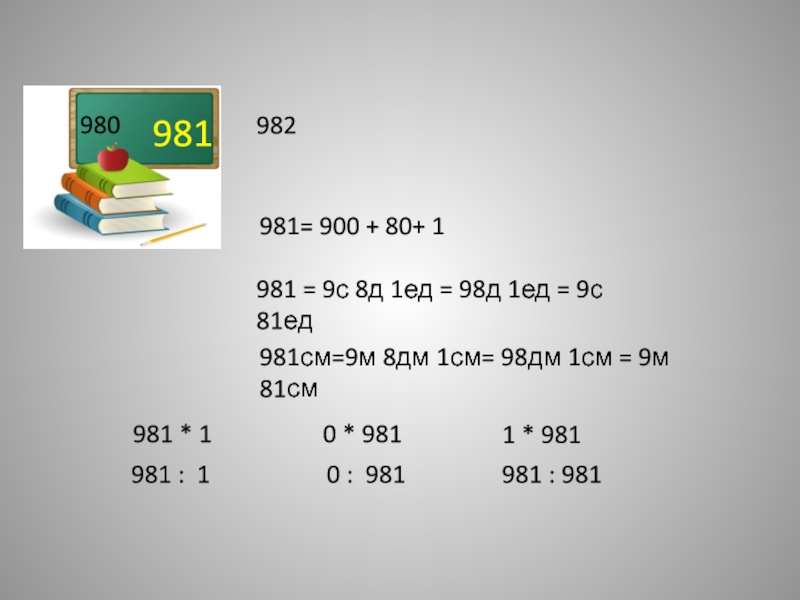 981см=9м 8дм 1см= 98дм 1см = 9м 81см