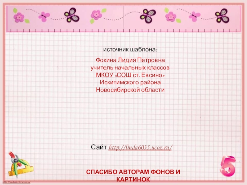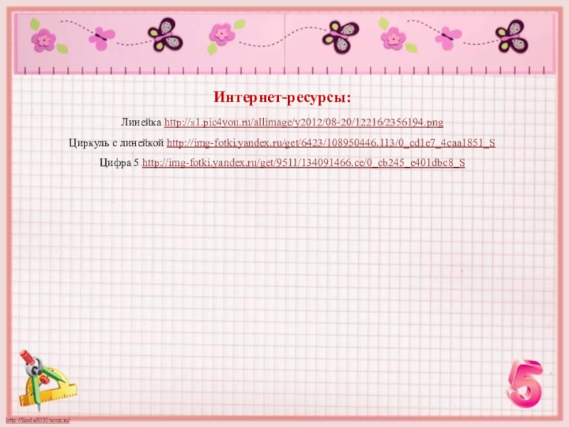 Интернет-ресурсы:Линейка http://s1.pic4you.ru/allimage/y2012/08-20/12216/2356194.png Циркуль с линейкой http://img-fotki.yandex.ru/get/6423/108950446.113/0_cd1e7_4caa1851_S Цифра 5 http://img-fotki.yandex.ru/get/9511/134091466.ce/0_cb245_e401dbc8_S