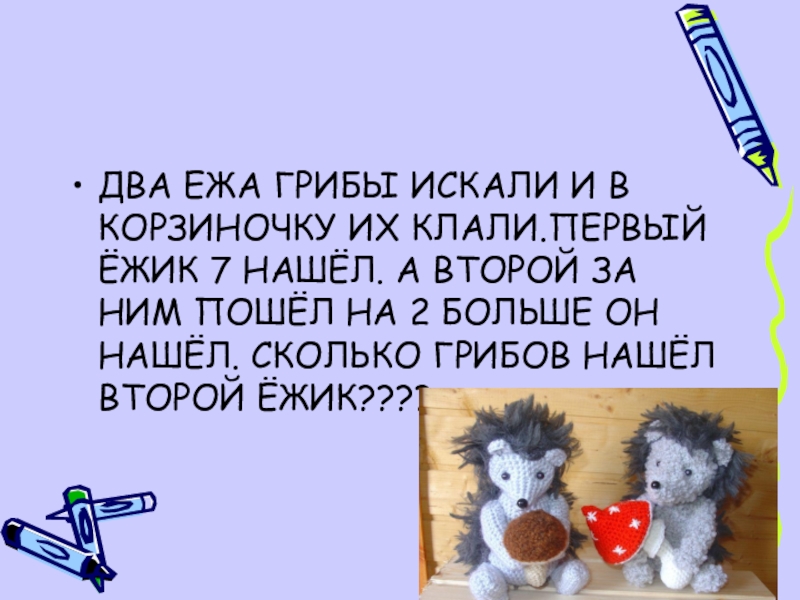 ДВА ЕЖА ГРИБЫ ИСКАЛИ И В КОРЗИНОЧКУ ИХ КЛАЛИ.ПЕРВЫЙ ЁЖИК 7 НАШЁЛ. А ВТОРОЙ ЗА НИМ ПОШЁЛ