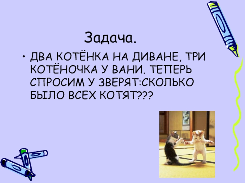 Задача.ДВА КОТЁНКА НА ДИВАНЕ, ТРИ КОТЁНОЧКА У ВАНИ. ТЕПЕРЬ СПРОСИМ У ЗВЕРЯТ:СКОЛЬКО БЫЛО ВСЕХ КОТЯТ???