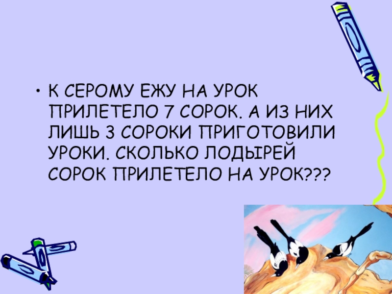 К СЕРОМУ ЕЖУ НА УРОК ПРИЛЕТЕЛО 7 СОРОК. А ИЗ НИХ ЛИШЬ 3 СОРОКИ ПРИГОТОВИЛИ УРОКИ. СКОЛЬКО
