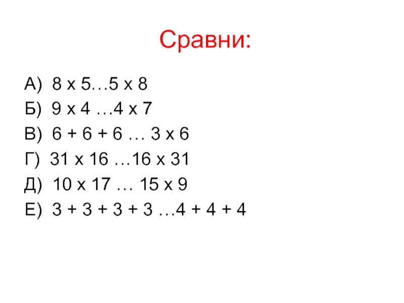 Сравни:А) 8 х 5…5 х 8Б) 9 х 4 …4 х 7В) 6 + 6 + 6