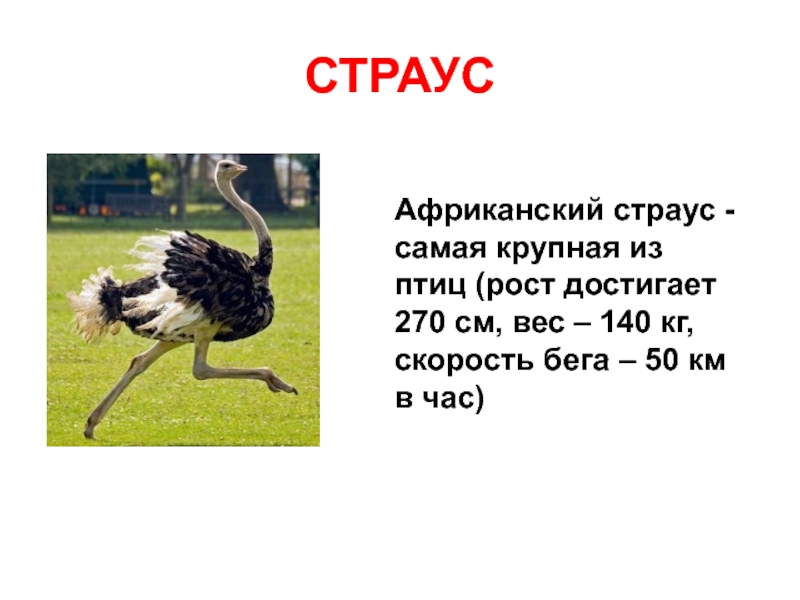СТРАУСАфриканский страус - самая крупная из птиц (рост достигает 270 см, вес – 140 кг, скорость бега