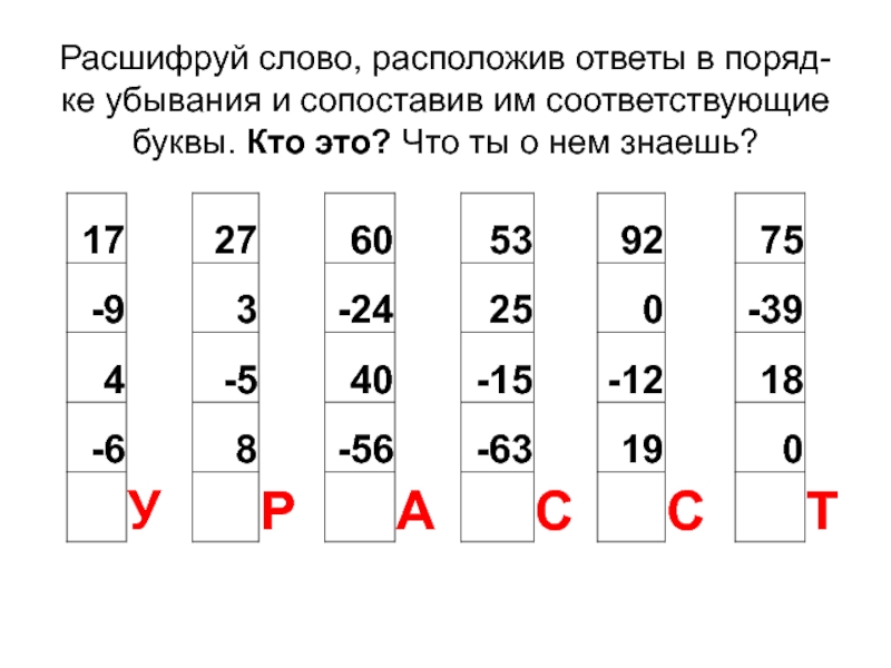 Расшифруй слово, расположив ответы в поряд-ке убывания и сопоставив им соответствующие буквы. Кто это? Что ты о