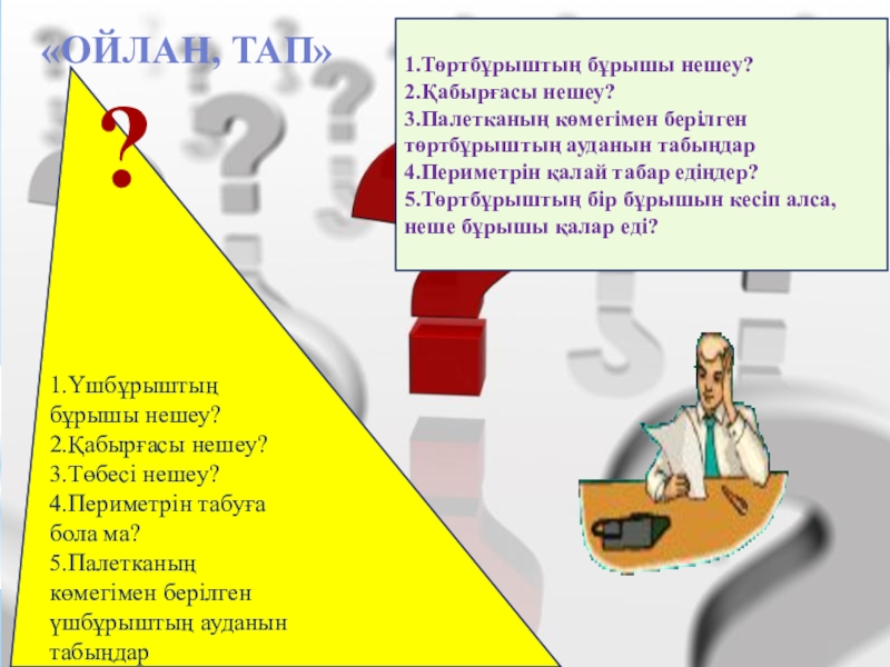 5.Төртбұрыштың бір бұрышын кесіп алса, неше бұрышы қалар еді?