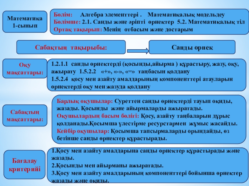 1.2.1.1 санды өрнектерді (қосынды,айырма ) құрастыру, жазу, оқу, ажырату 1.5.2.2 «+», «-», «=» таңбасын қолдану