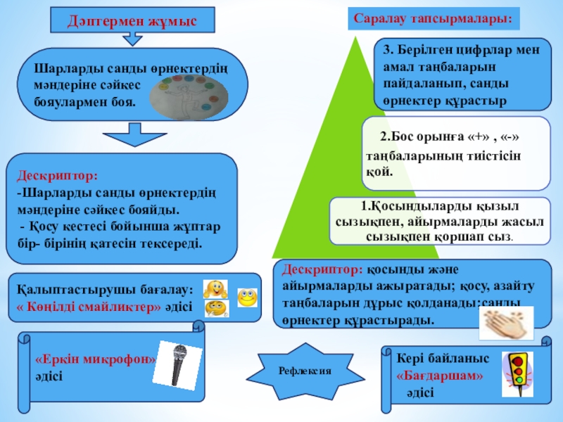Оқушылардың басым бөлігі: Қосу, азайту таңбаларын дұрыс қолданады.Қосымша үлестірме ресурстармен жұмыс жасайд ы.
