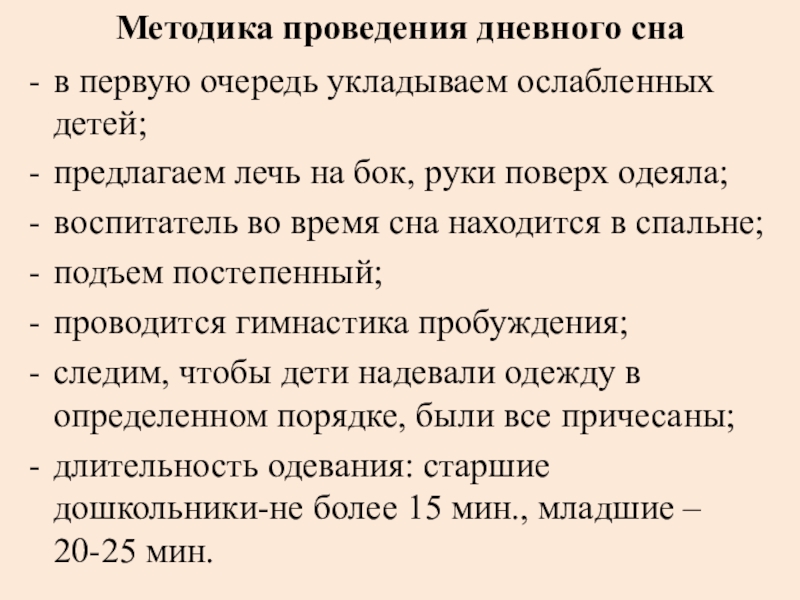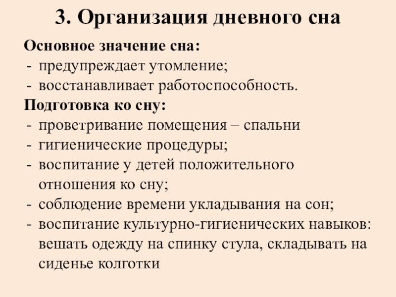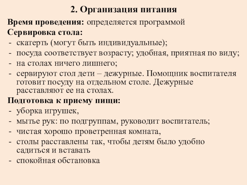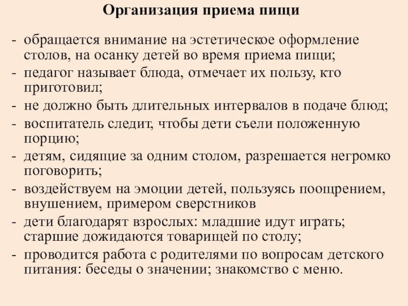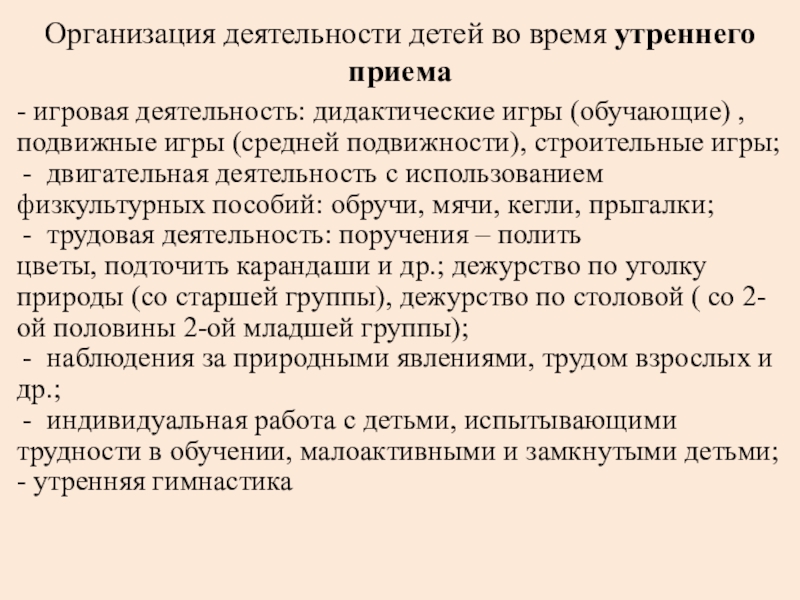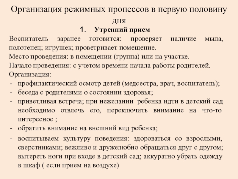 процессов в первую половину дня: утренний прием; организация питания; дневной сон.