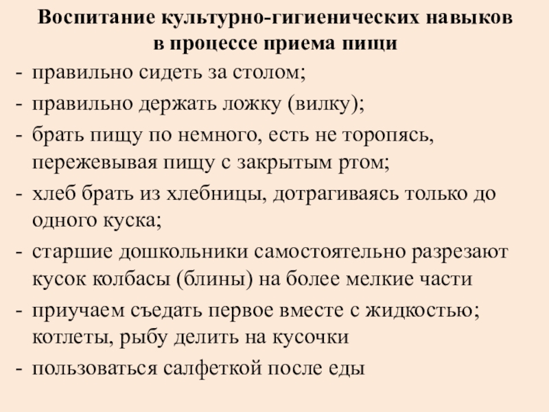 Слайд 6Воспитание культурно-гигиенических навыков в процессе приема пищи