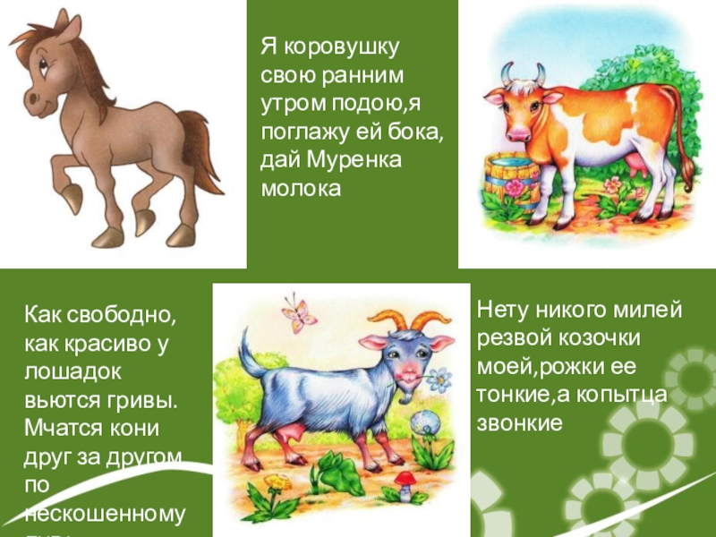 Нету никого милей резвой козочки моей,рожки ее тонкие,а копытца звонкие