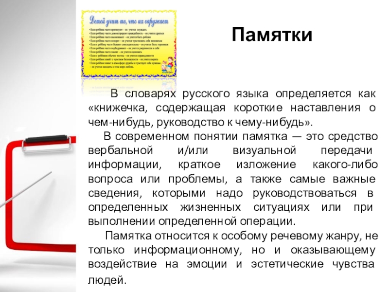 Памятка относится к особому речевому жанру, не только информационному, но и оказывающему воздействие на эмоции и эстетические чувства людей.