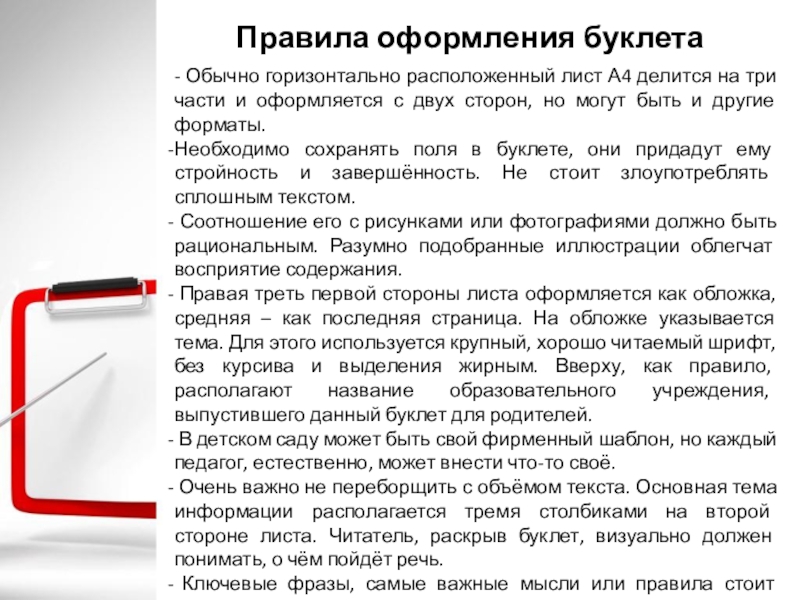Буклеты очень подходят для информирования родителей (удобные и не занимают много места), так как не всегда родители читают объявления (спешат на работу). А так очень удобно по пути на работу в автобусе или метро почитать, ознакомиться с информацией.