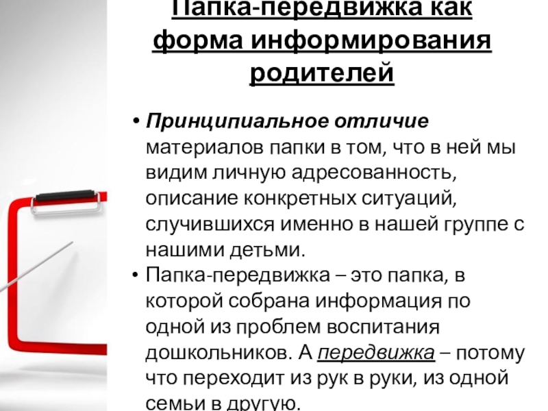 Папка-передвижка – это папка, в которой собрана информация по одной из проблем воспитания дошкольников. А передвижка – потому что переходит из рук в руки, из одной семьи в другую.