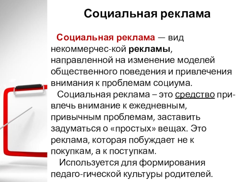Социальная реклама — вид некоммерчес-кой рекламы,