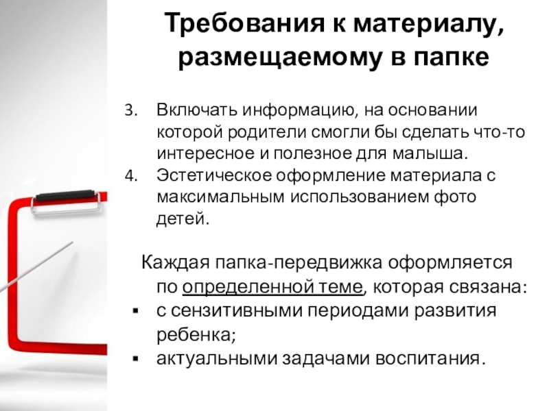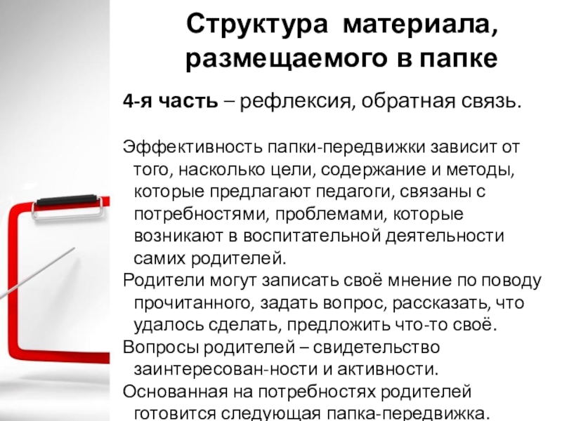 Эффективность папки-передвижки зависит от того, насколько цели, содержание и методы, которые предлагают педагоги, связаны с потребностями, проблемами, которые возникают в воспитательной деятельности самих родителей.
