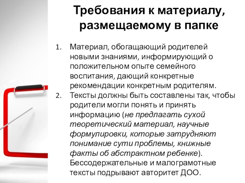 Тексты должны быть составлены так, чтобы родители могли понять и принять информацию (не предлагать сухой теоретический материал, научные формулировки, которые затрудняют понимание сути проблемы, книжные факты об абстрактном ребенке). Бессодержательные и малограмотные тексты подрывают авторитет ДОО.