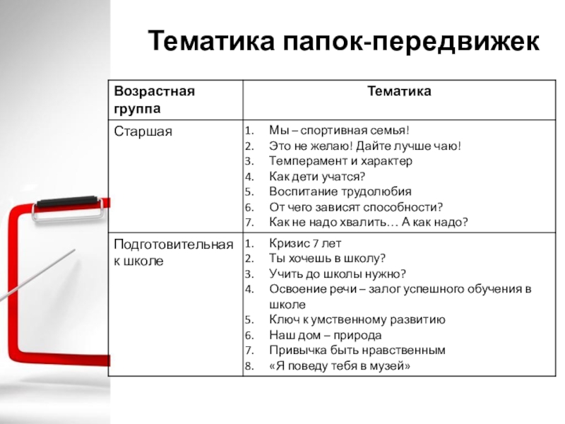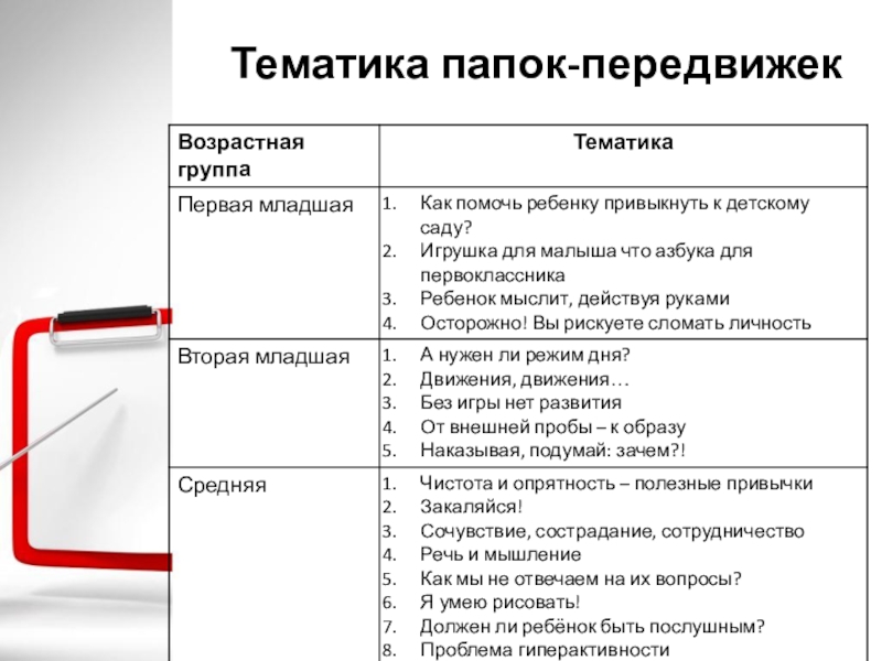 Каждая папка-передвижка оформляется по определенной теме, которая связана: