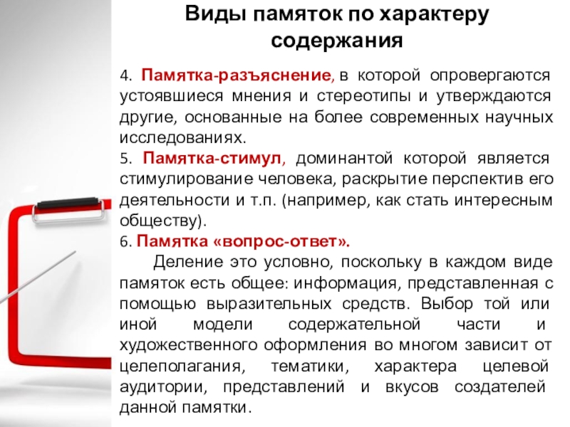 Деление это условно, поскольку в каждом виде памяток есть общее: информация, представленная с помощью выразительных средств. Выбор той или иной модели содержательной части и художественного оформления во многом зависит от целеполагания, тематики, характера целевой аудитории, представлений и вкусов создателей данной памятки.