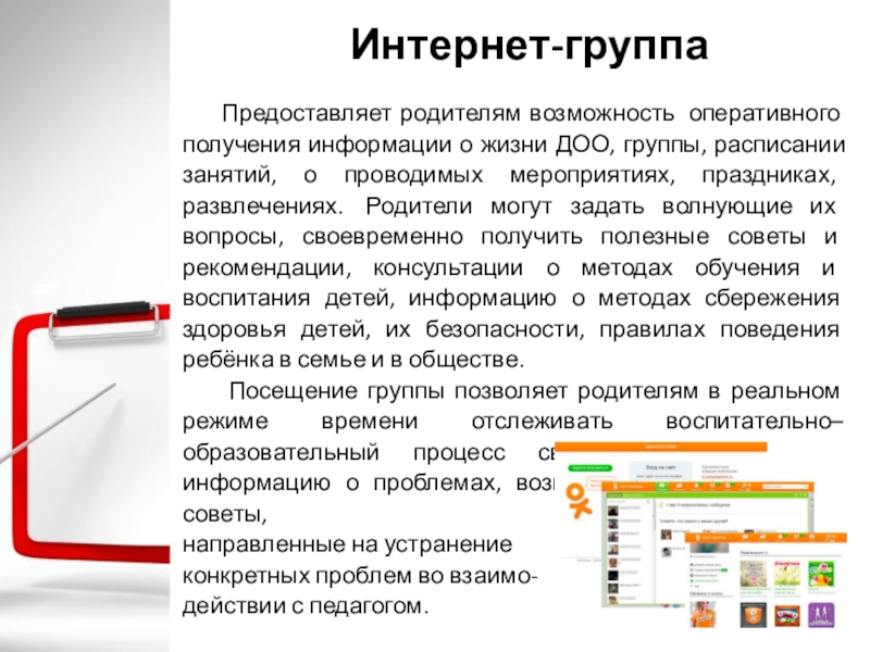 о жизни ДОО, группы, расписании занятий, о проводимых мероприятиях, праздниках, развлечениях. Родители могут задать волнующие их вопросы, своевременно получить полезные советы и рекомендации, консультации о методах обучения и воспитания детей, информацию о методах сбережения здоровья детей, их безопасности, правилах поведения ребёнка в семье и в обществе.