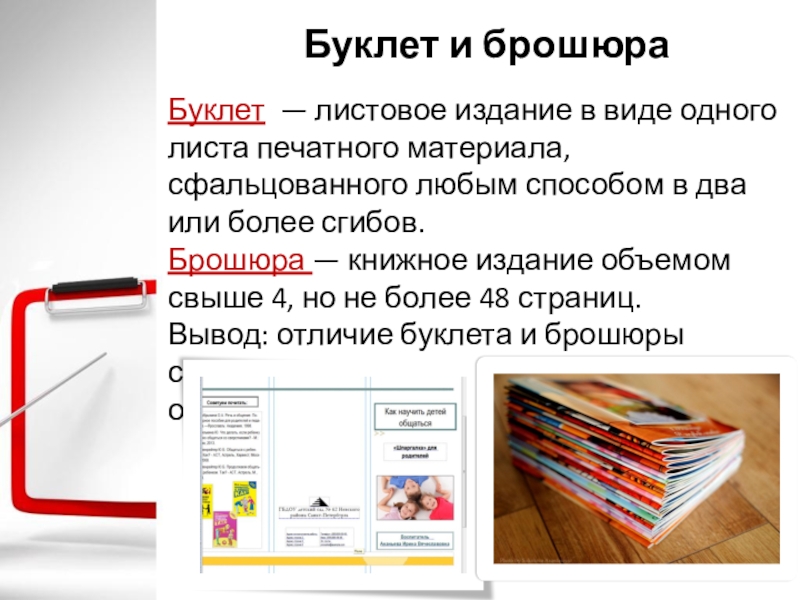 Вывод: отличие буклета и брошюры состоит в материальной конструкции и объеме.