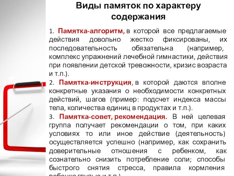 3. Памятка-совет, рекомендация. В ней целевая группа получает рекомендации о том, при каких условиях то или иное действие (деятельность) осуществляется успешно (например, как сохранить доверительные отношения с ребенком, как сознательно снизить потребление соли; способы быстрого снятия стресса, правила кормления ребенка грудью и т.п.).