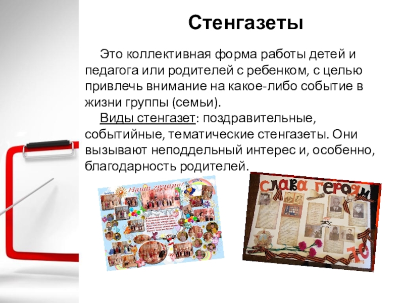 Виды стенгазет: поздравительные, событийные, тематические стенгазеты. Они вызывают неподдельный интерес и, особенно, благодарность родителей.