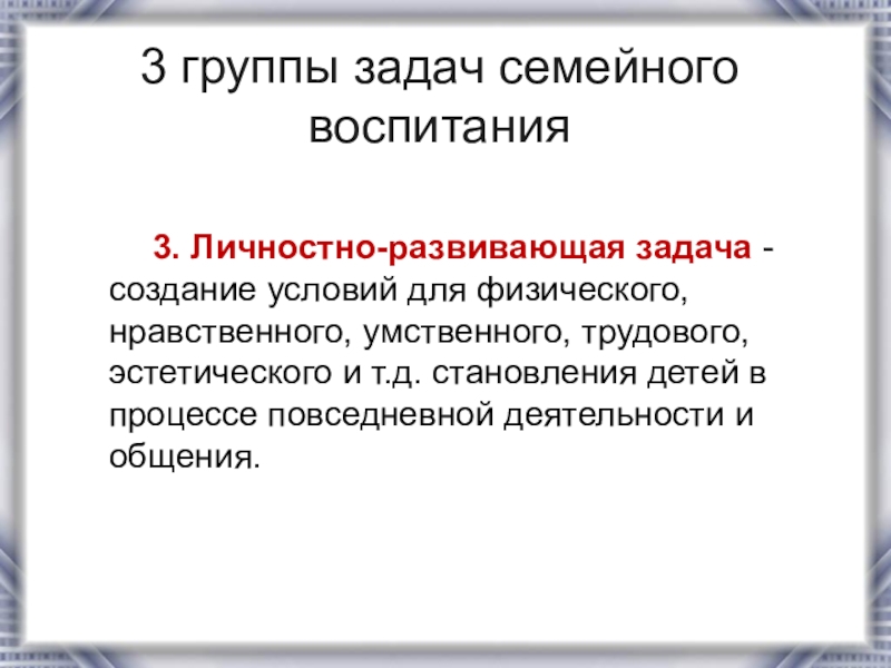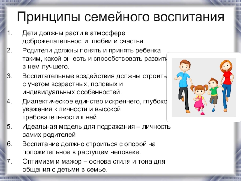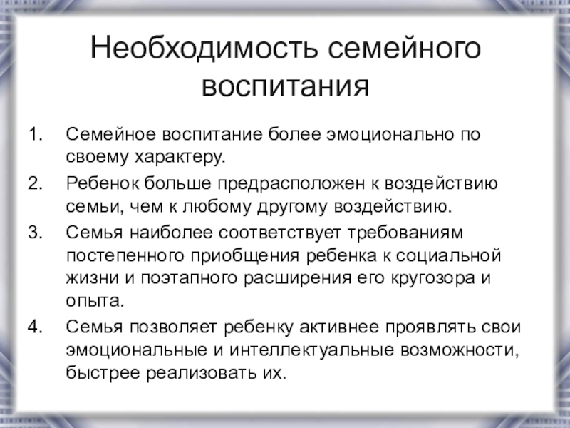 Слайд 3Семейное воспитание – это систематическое целенаправленное воздействие на ребенка взрослых членов