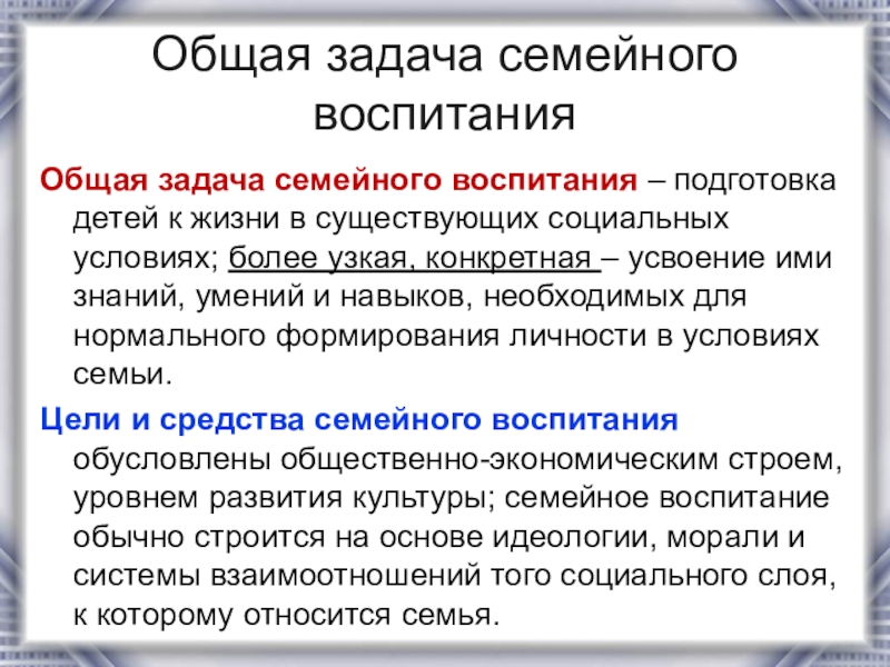 Цели и средства семейного воспитания обусловлены общественно-экономическим строем, уровнем развития культуры; семейное воспитание обычно строится на основе идеологии, морали и системы взаимоотношений того социального слоя, к которому относится семья.