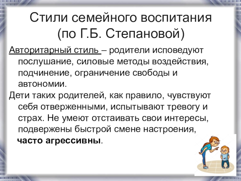 Дети таких родителей, как правило, чувствуют себя отверженными, испытывают тревогу и страх. Не умеют отстаивать свои интересы, подвержены быстрой смене настроения,