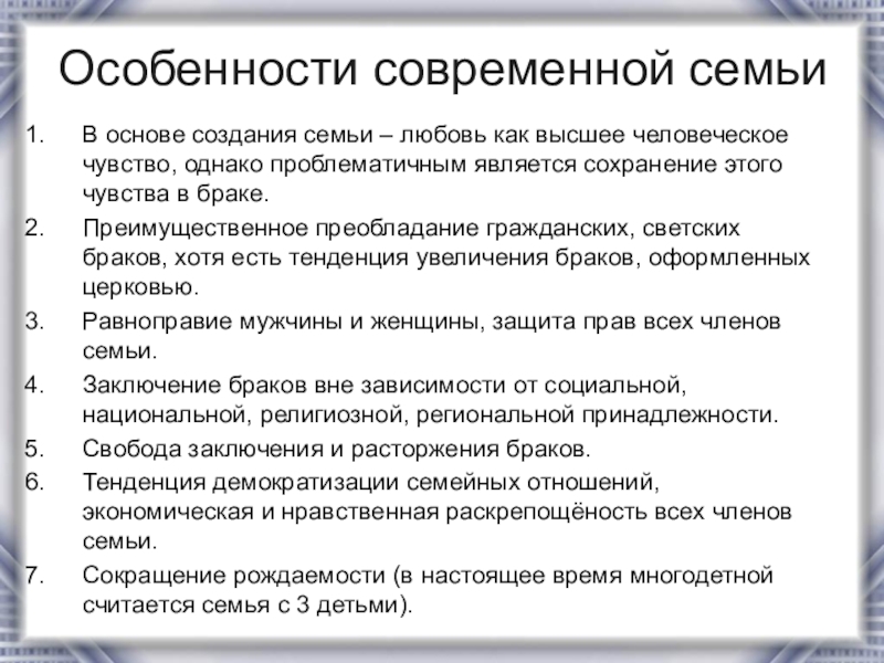 Тенденция демократизации семейных отношений, экономическая и нравственная раскрепощёность всех членов семьи.