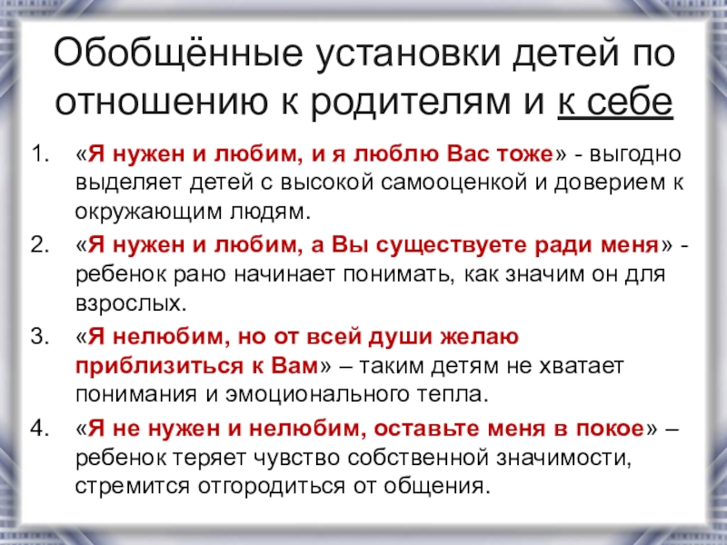 Слайд 17Обобщённые установки детей по отношению к родителям и к себе