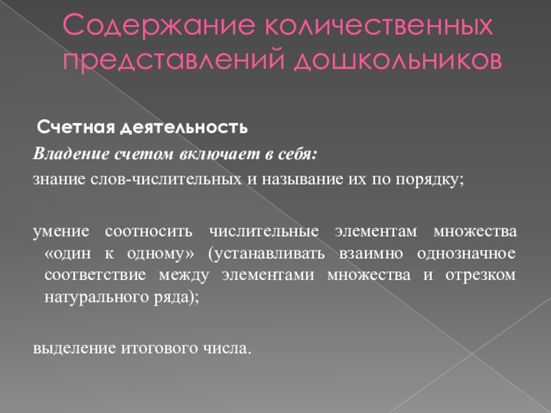 умение соотносить числительные элементам множества «один к одному» (устанавливать взаимно однозначное соответствие между элементами множества и отрезком натурального ряда);